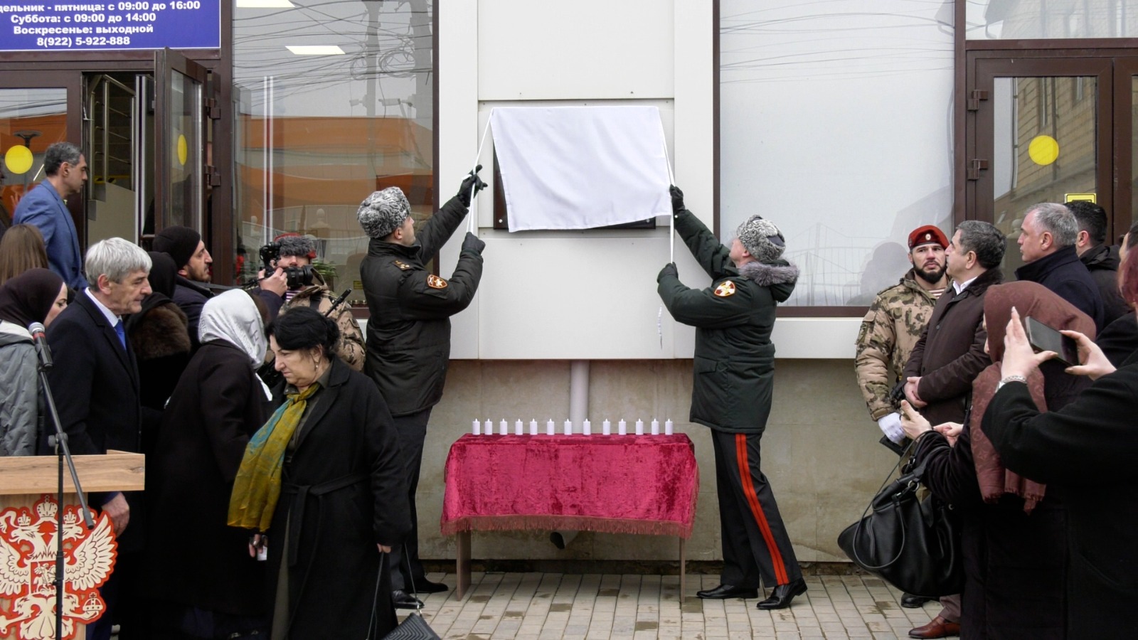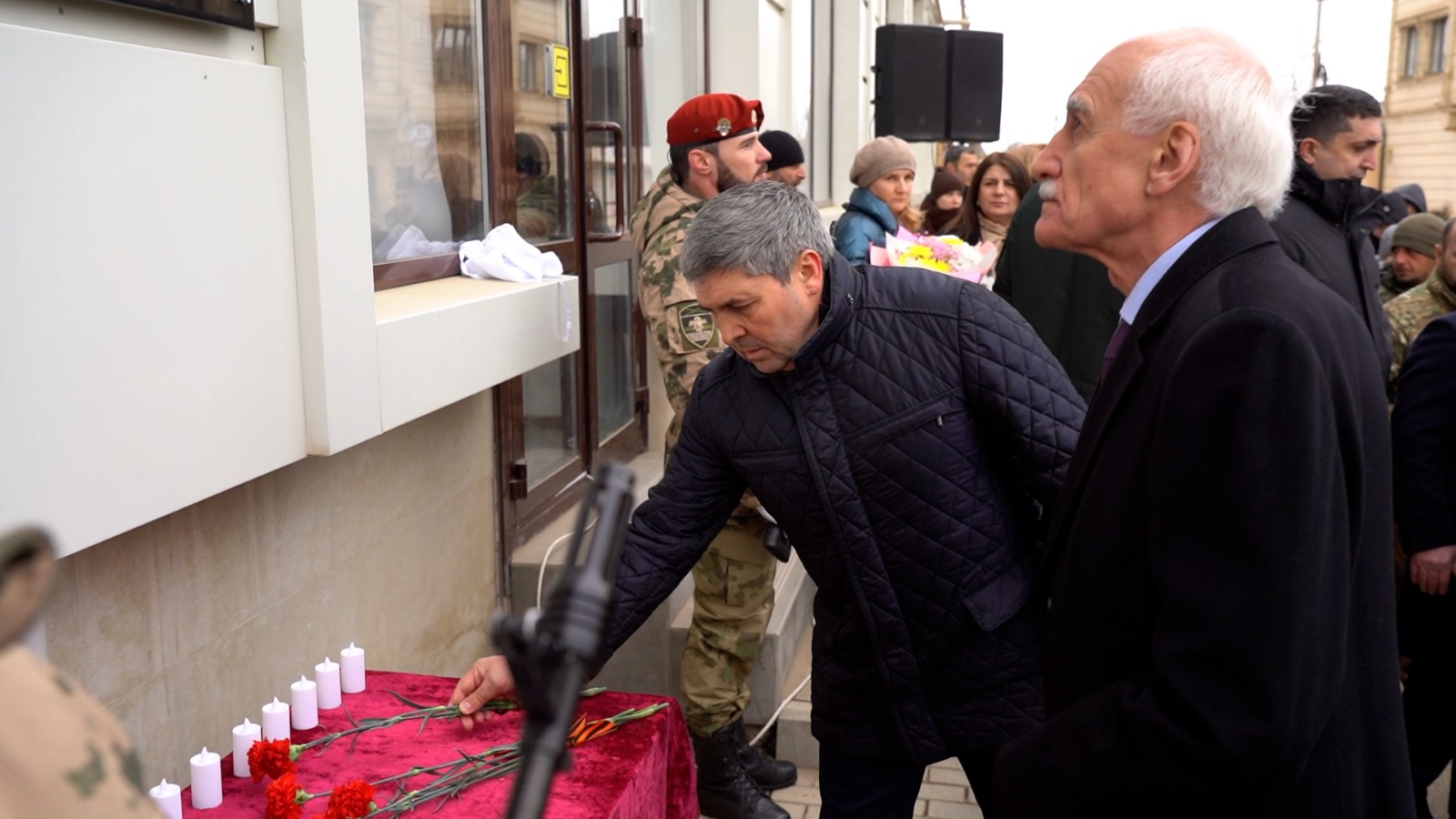 Почетное право открыть мемориальную доску было предоставлено заместителю Руководителя Администрации Главы и Правительства РД Наипу Сепиханову и командиру бригады Махачкалинского соединения Росгвадии генерал-майору Дмитрию Чистякову. Затем к подножию мемориала легли живые цветы, а кульминацией церемонии стал троекратный ружейный салют и бело-сине-красные шары, выпущенные в небо.