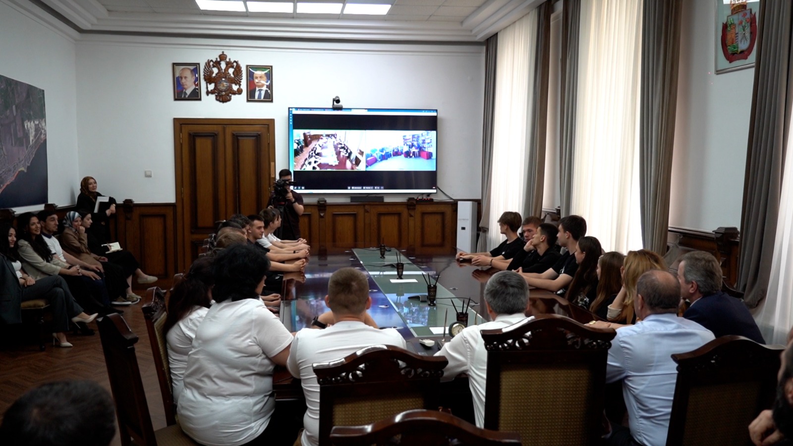 Вместе с детьми в видеоконференции приняли участие глава города Дербента Ахмед Кулиев, председатель Собрания депутатов Гасан Мирзоев и начальник Управления образования Чимназ Алиева. В Херсонской области на связь вышли заместитель главы Каланчакского муниципального округа Галина Мирошниченко, представители администрации, родственники детей.