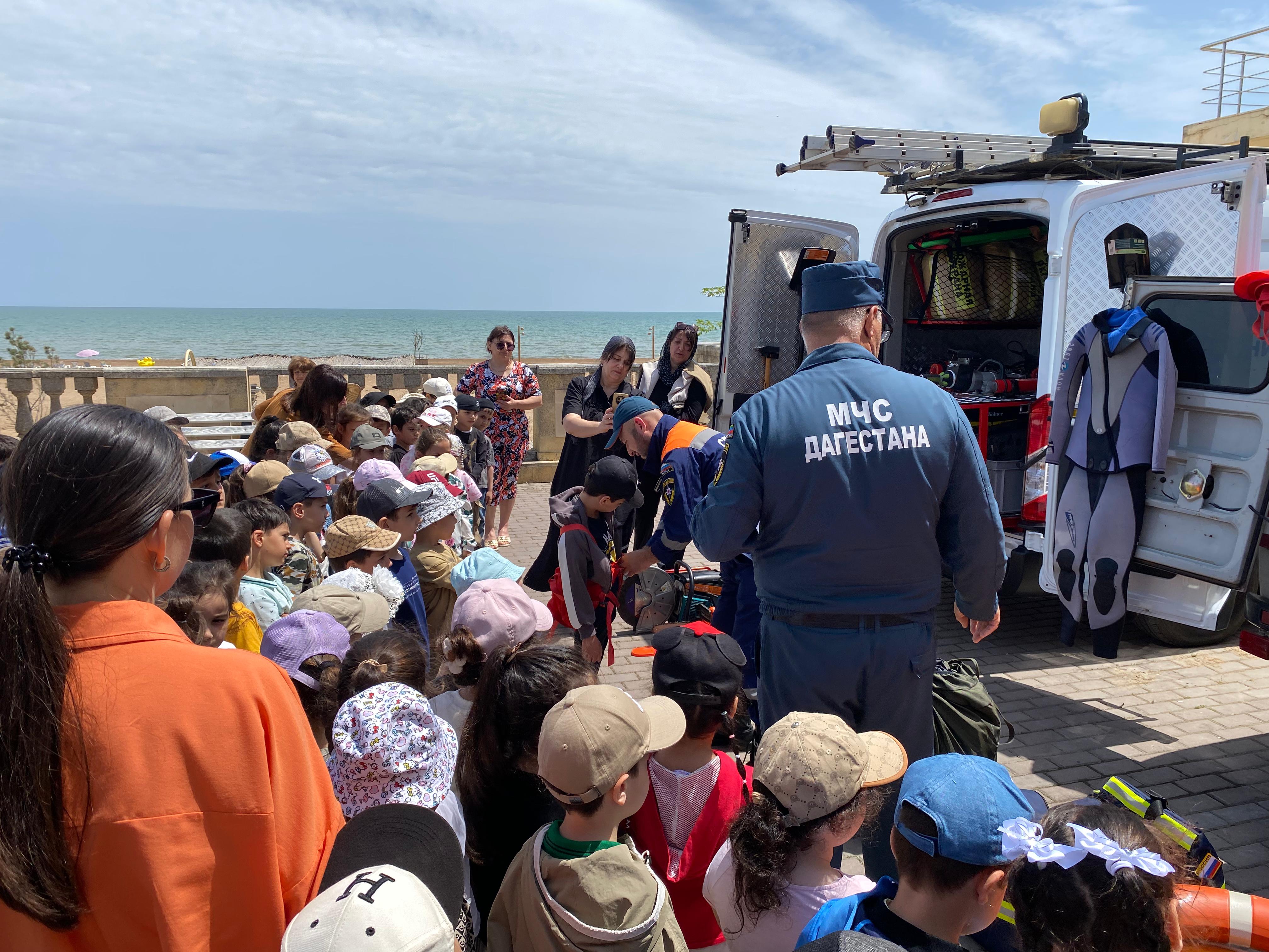 Заместитель начальника Дербентского поисково-спасательного подразделения Омар Омаров, спасатель 1 класса Максуд Гагаев и спасатель 2 класса Заур Рабаданов познакомили ребят с деятельностью подразделения, показали технику и снаряжения, рассказали об условиях их применения. Детям был продемонстрирован гидравлический аварийно-спасательный инструмент, показана работа других образцов аварийно-спасательной техники и оборудования. Им напомнили о правилах безопасности дома, в лесу, у воды, на улице, на транспорте, а также о способах оказания первой помощи и номерах телефонов экстренных служб.