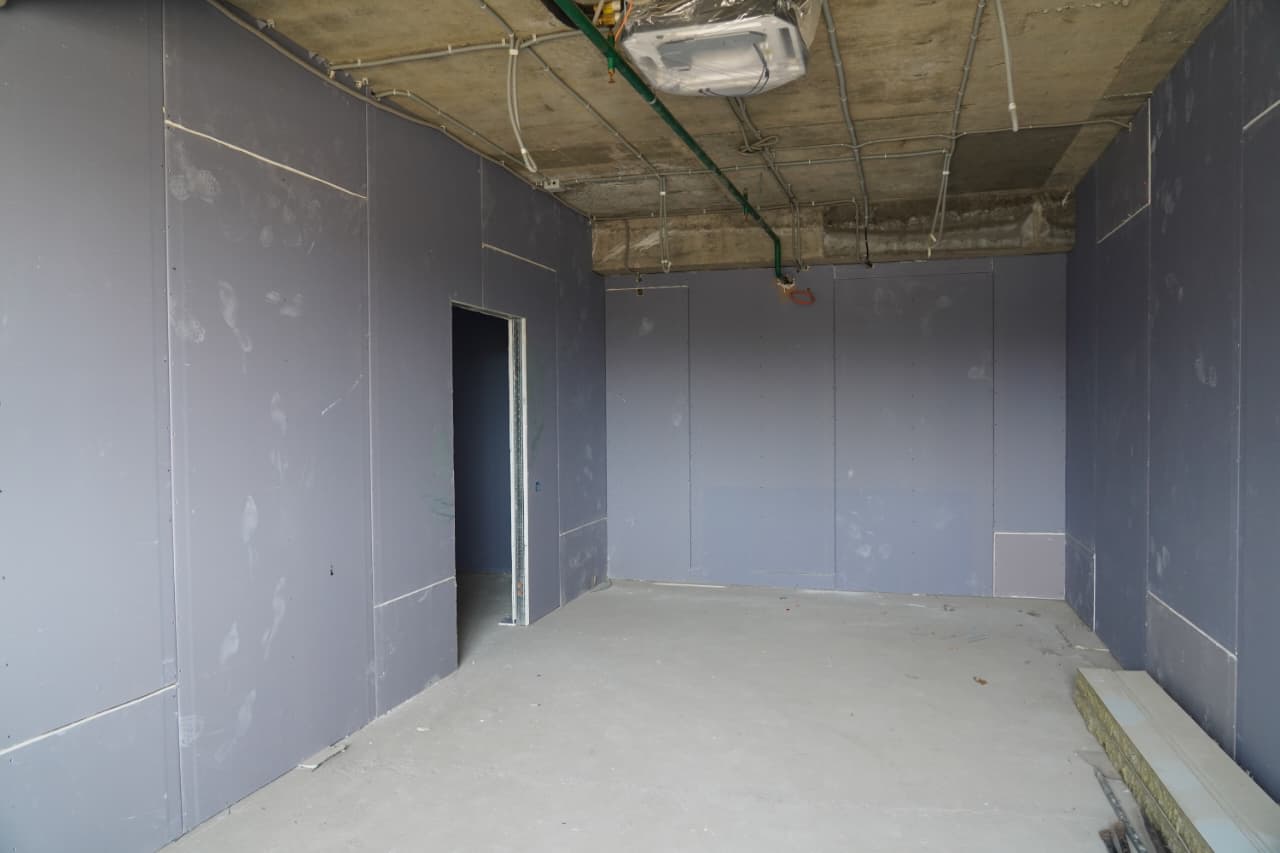 Внутри здания устанавливаются пилоны и вентиляционные короба, формируются гипсокартонные перегородки, монтируется система охлаждения.